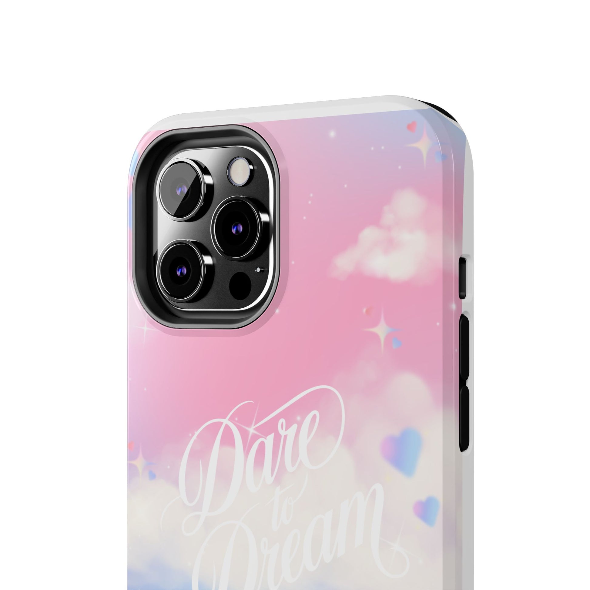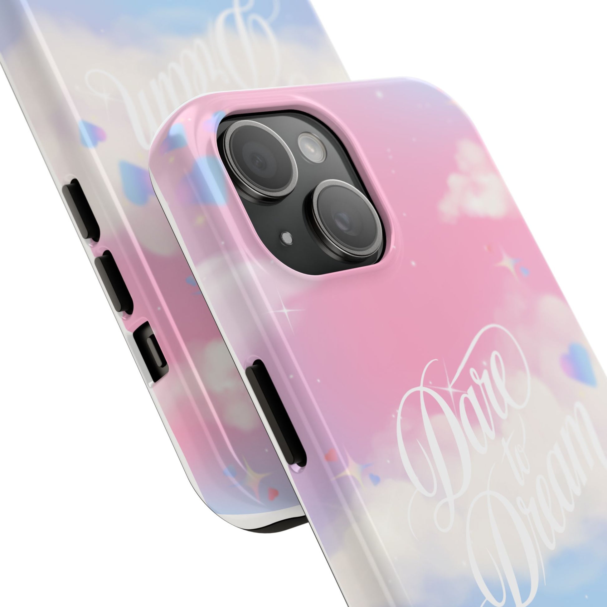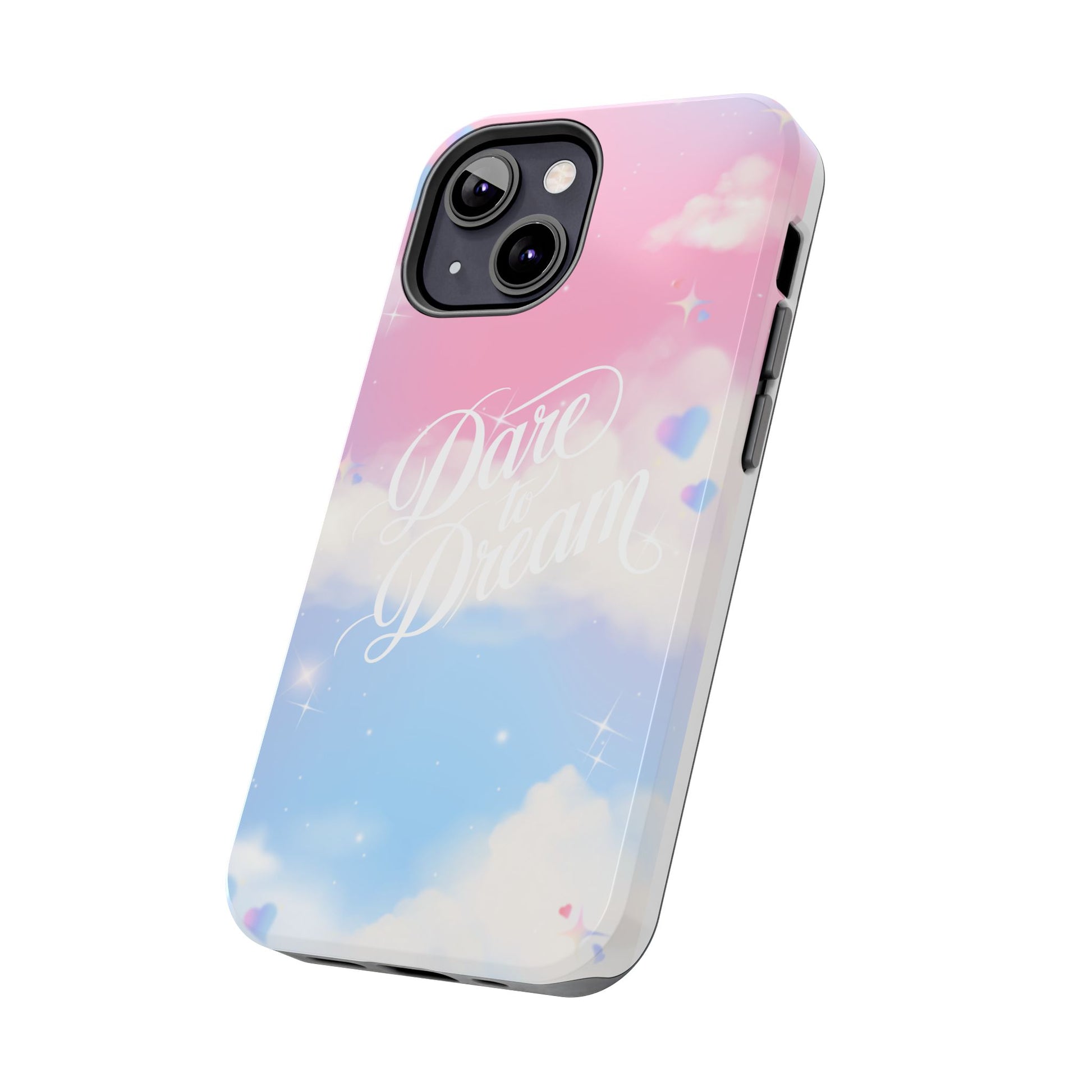 A dreamy, protective phone case that wraps your device in soft pastels and cloudlike whimsy. Lightweight but built to withstand daily drops, the two-piece shell and flexible rubber liner work together to absorb shocks while the lay-flat bezel guards the screen from surface scratches. The glossy finish lets the pink-to-blue gradient, floating hearts and hand-lettered “Dare to Dream” script shimmer under light, and UV protection helps keep colors vivid through everyday sun exposure. This case supports wireless charging and fits current phone models, offering reliable, everyday defense with a gentle, aspirational aesthetic that speaks to anyone who carries a little optimism with them.