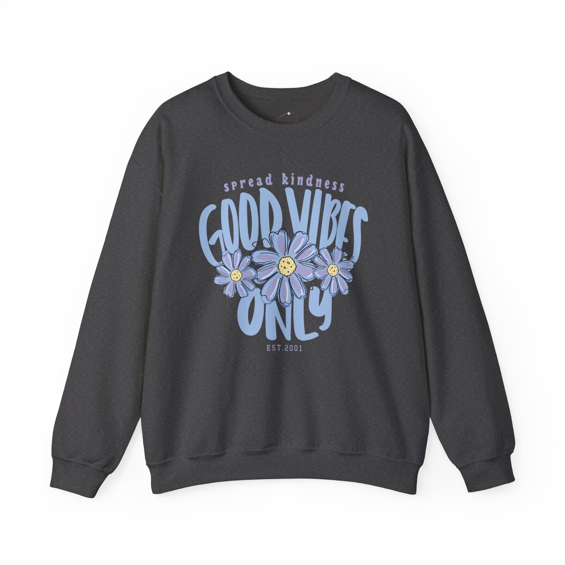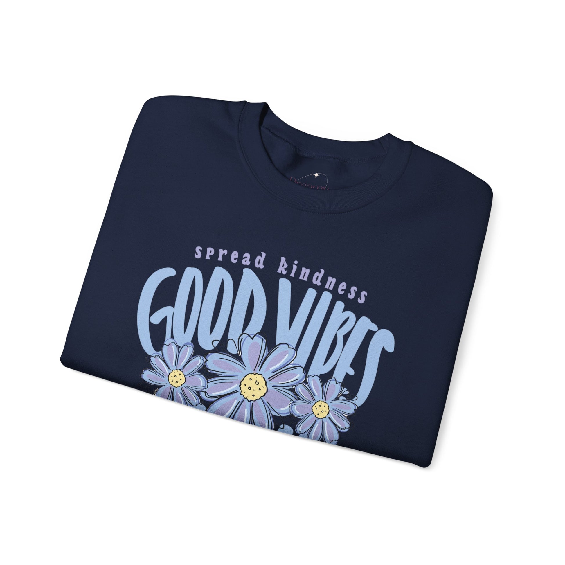 Light, soft, and quietly cheerful — this crewneck brings a gentle burst of optimism to slow mornings and weekend walks. The mid-weight cotton-poly blend feels familiar and sturdy, with a relaxed classic fit that layers easily over tees or under jackets. Centered on the chest, a hand-drawn style graphic of smiling daisies with the gentle reminder to “Spread Kindness” and “Good Vibes Only,” giving the sweatshirt a retro, feel-good energy without shouting for attention. Subtle details — like a tear-away label for no-scratch comfort and reinforced double-needle stitching — mean this will be reached for again and again. It wears like a friend you can depend on: cozy at home, brightening a coffee run, or keeping you comfy on a late-night drive.