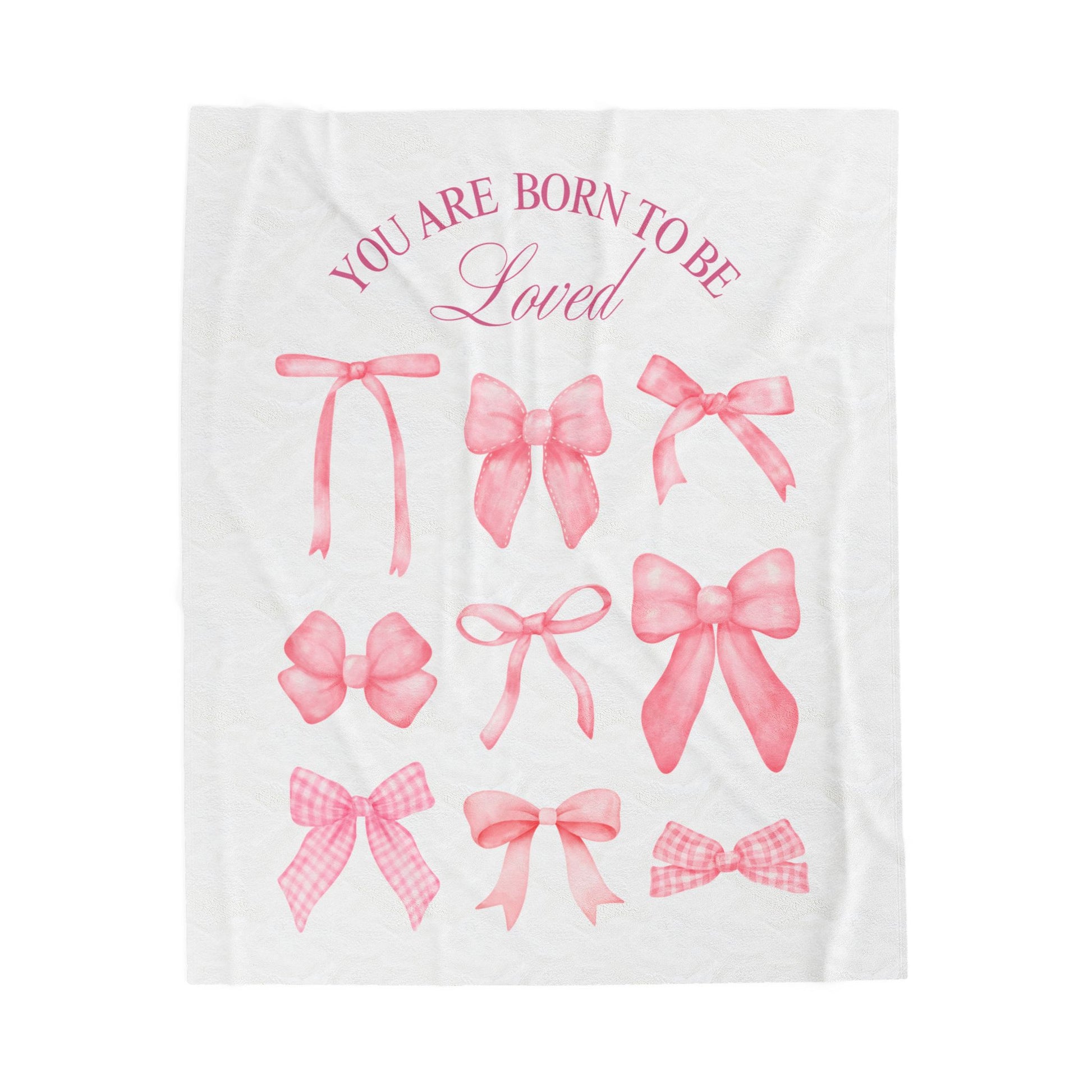 This plush velveteen blanket is made to be wrapped around quiet evenings and slow mornings. The extra-soft medium-weight fabric drapes like a warm hug, the various pink bows and subtle words “ You Are Born To Be Loved” that stay vibrant wash after wash. It settles against skin without weighty bulk, offering gentle warmth for cool rooms or late-night reading sessions. Thoughtfully stitched along every edge, the blanket is built to last while staying safe: it meets strict flammability and chemical-safety standards. Designed for adult use, it arrives ready to become the go-to layer for sofa lounging, movie nights, and hand-wrapped comfort after a long day.